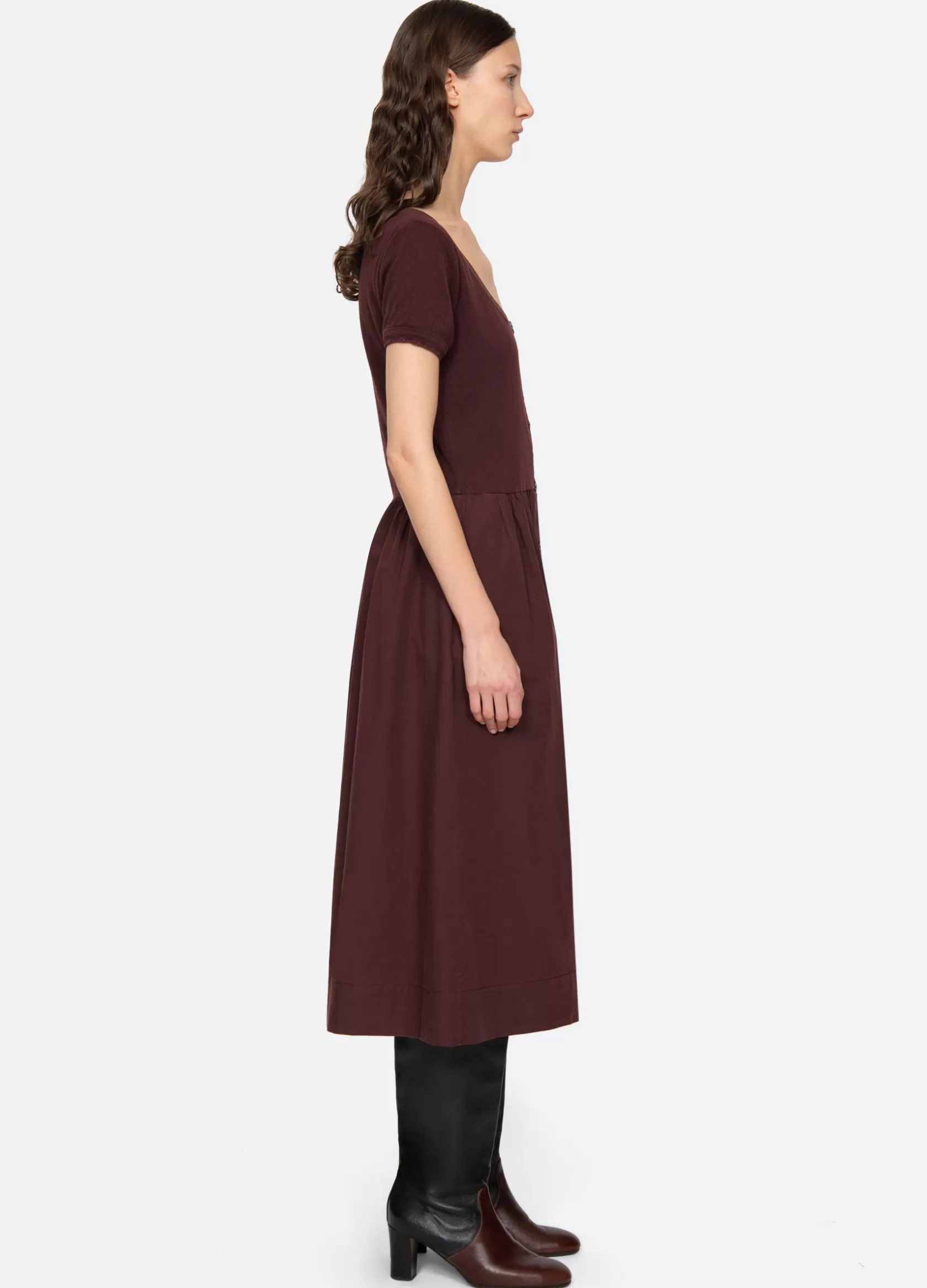 The Renata dress features short sleeves, ribbed bodice and button front closure.