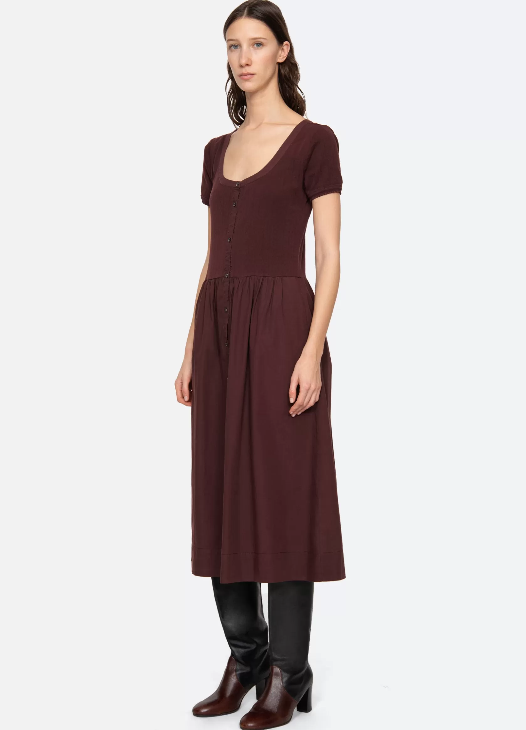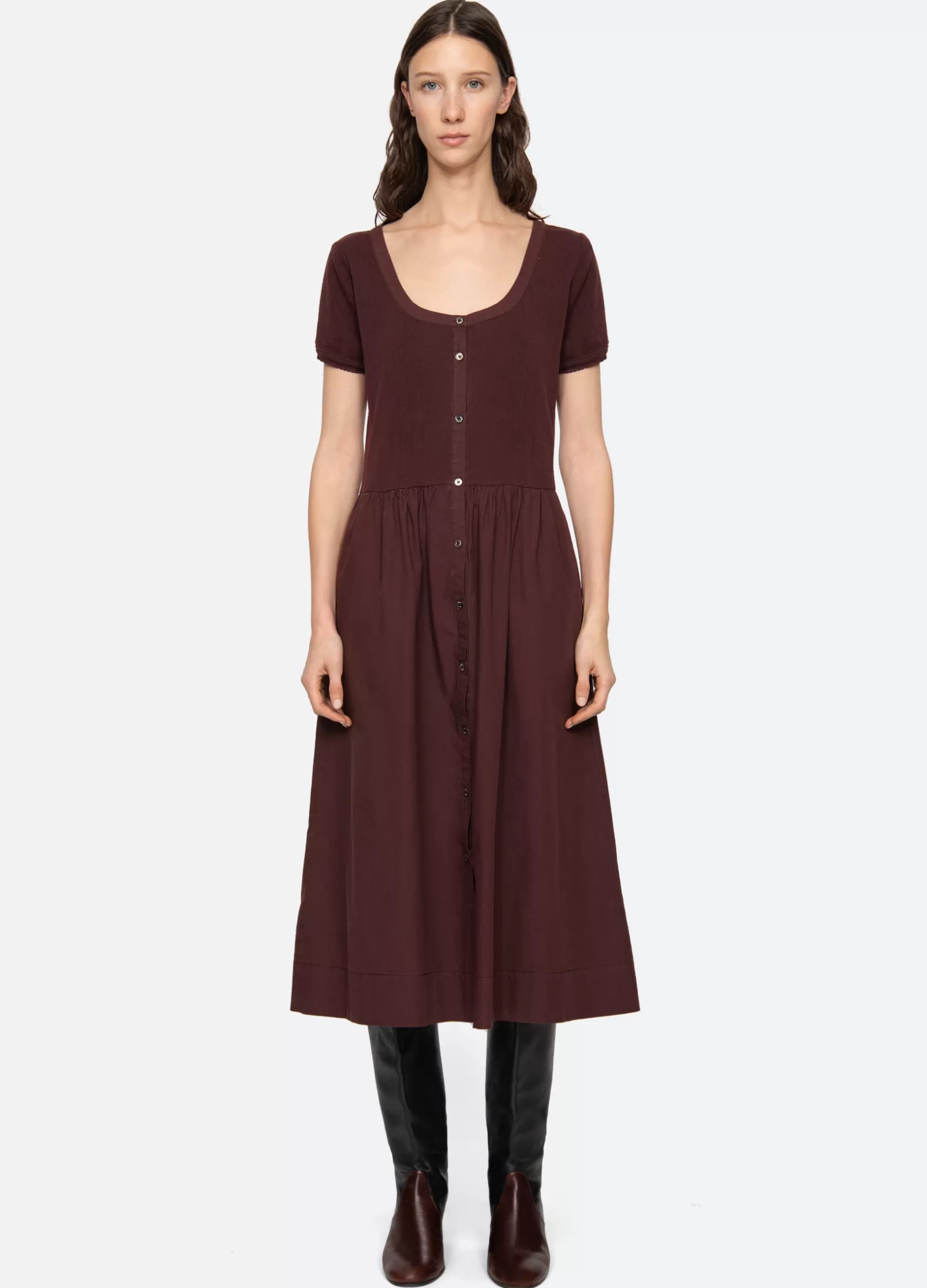 The Renata dress features short sleeves, ribbed bodice and button front closure.Details:self-100% cottoncombo-100% cotto…