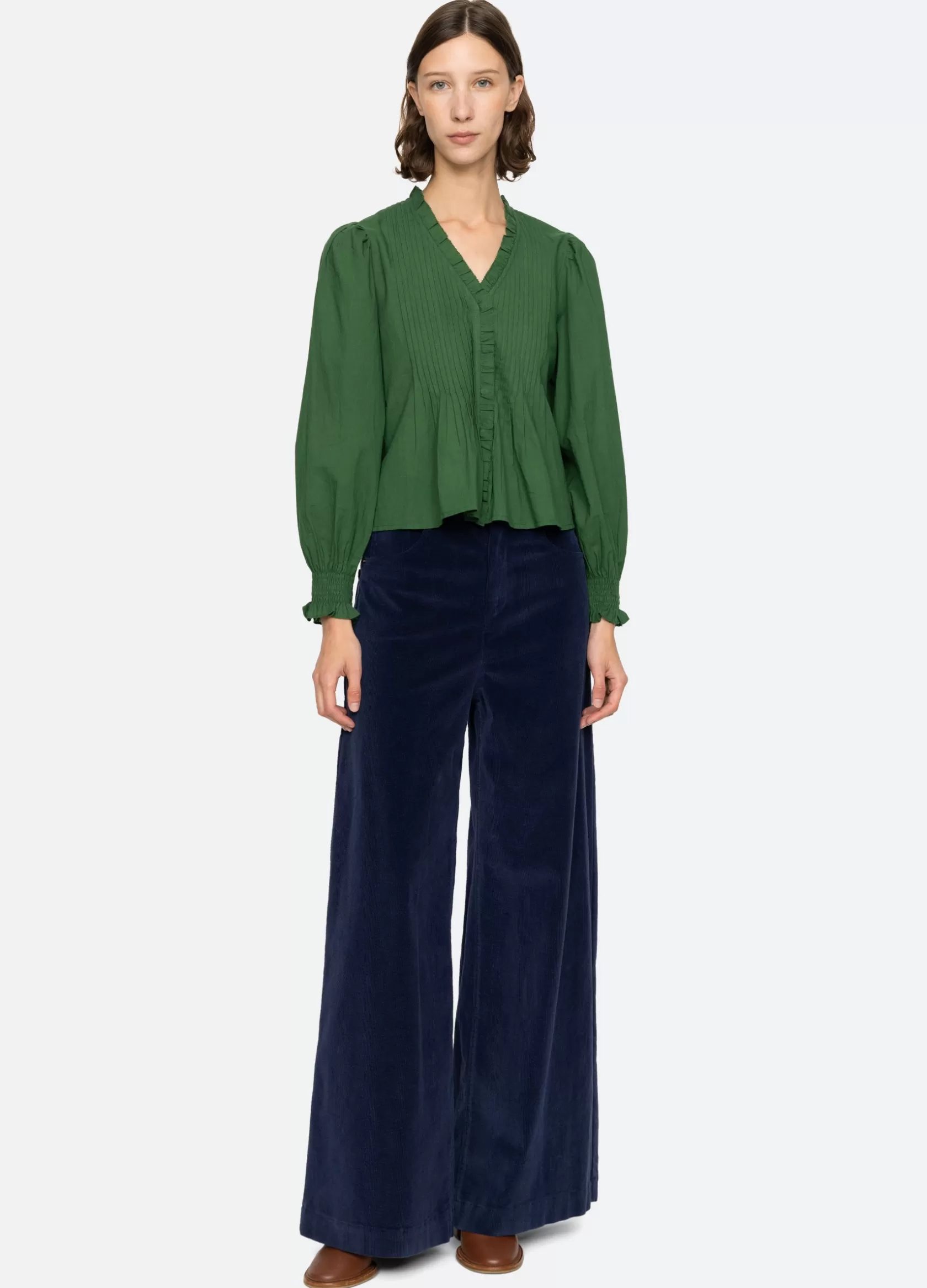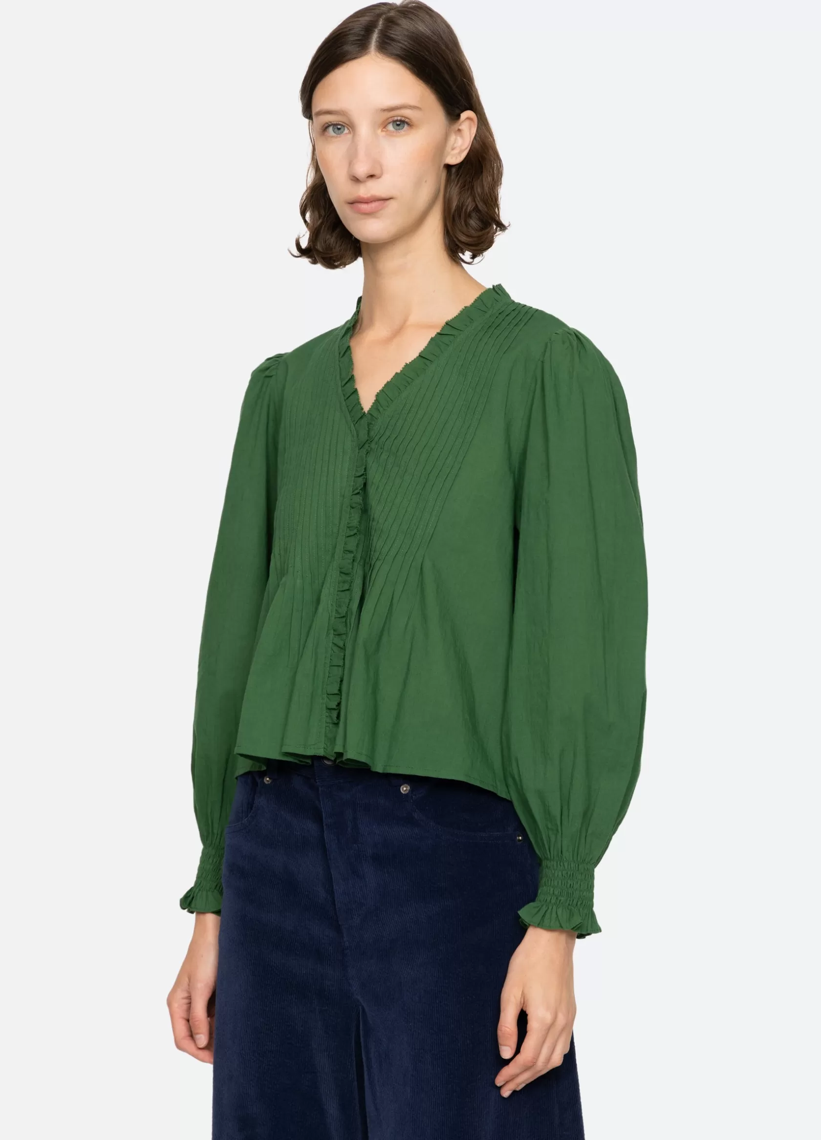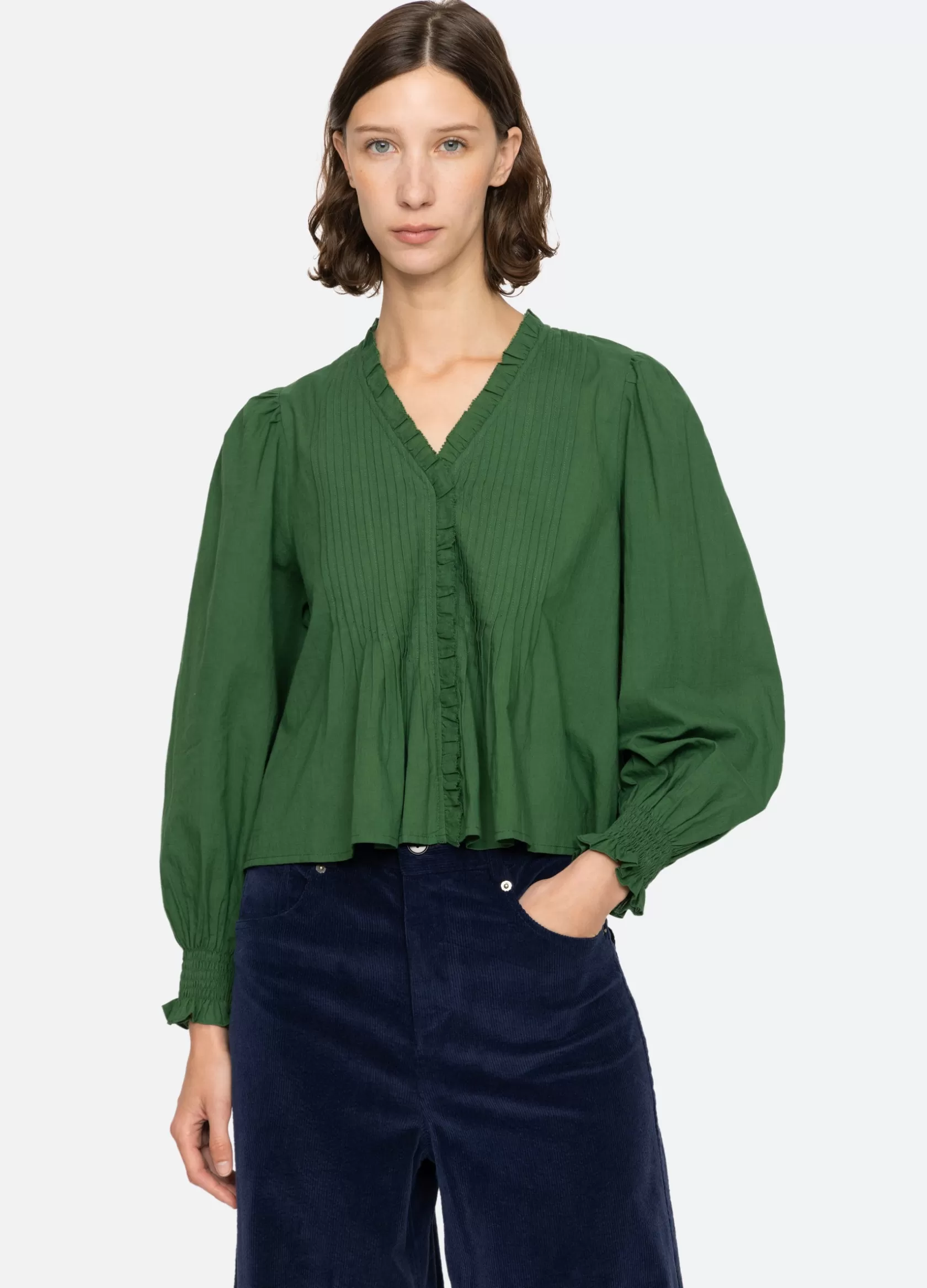 The Renata long sleeve top features a ruffled v-neckline and pleated detailing.