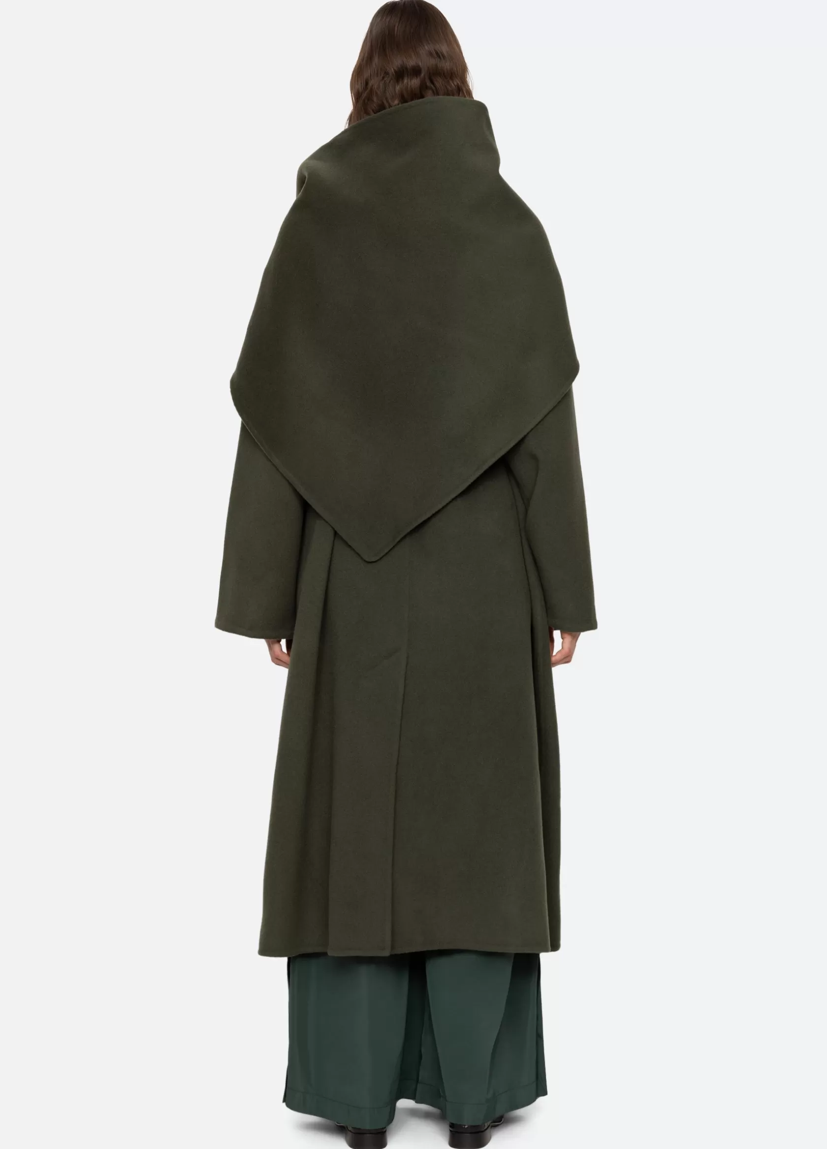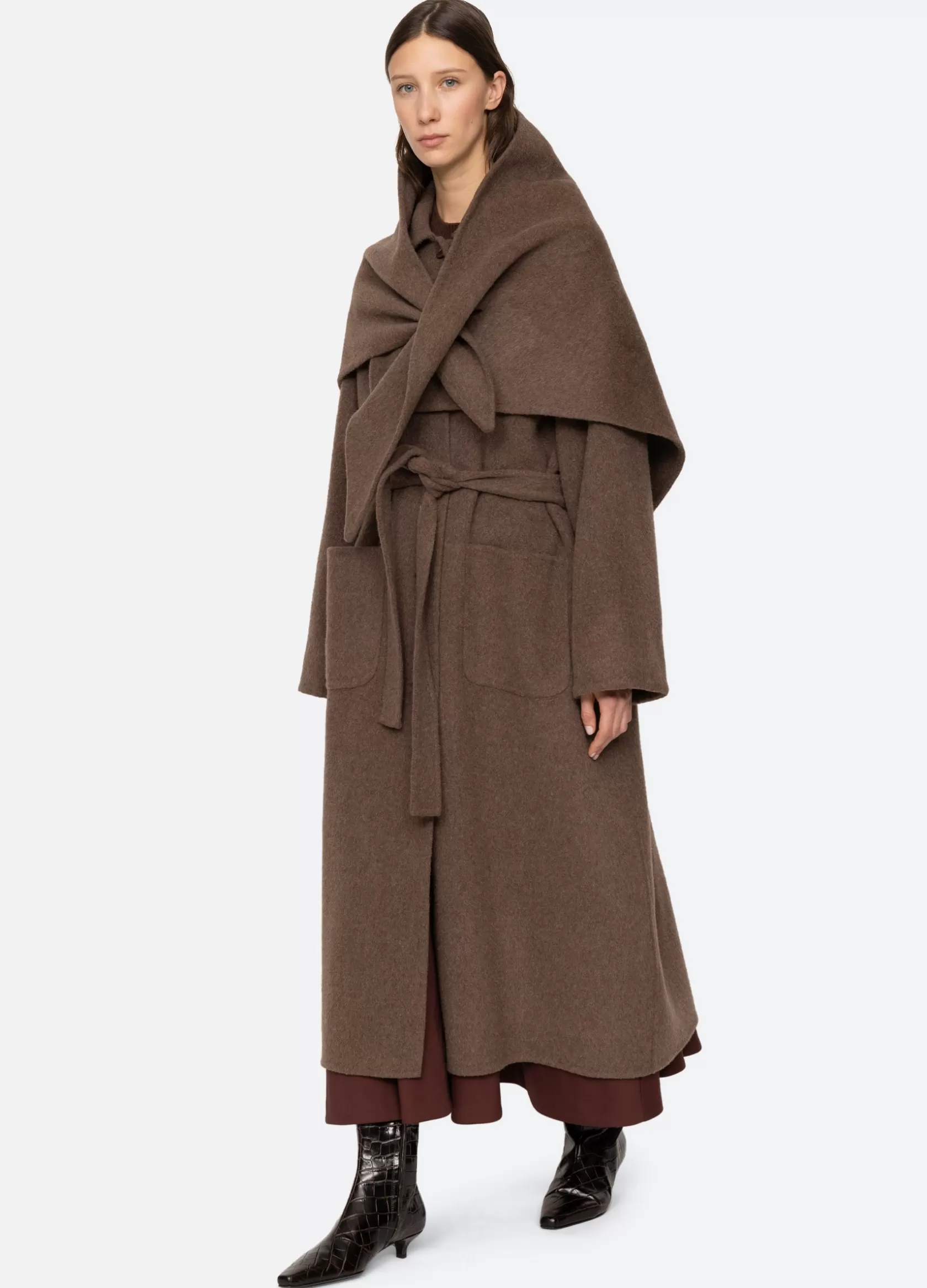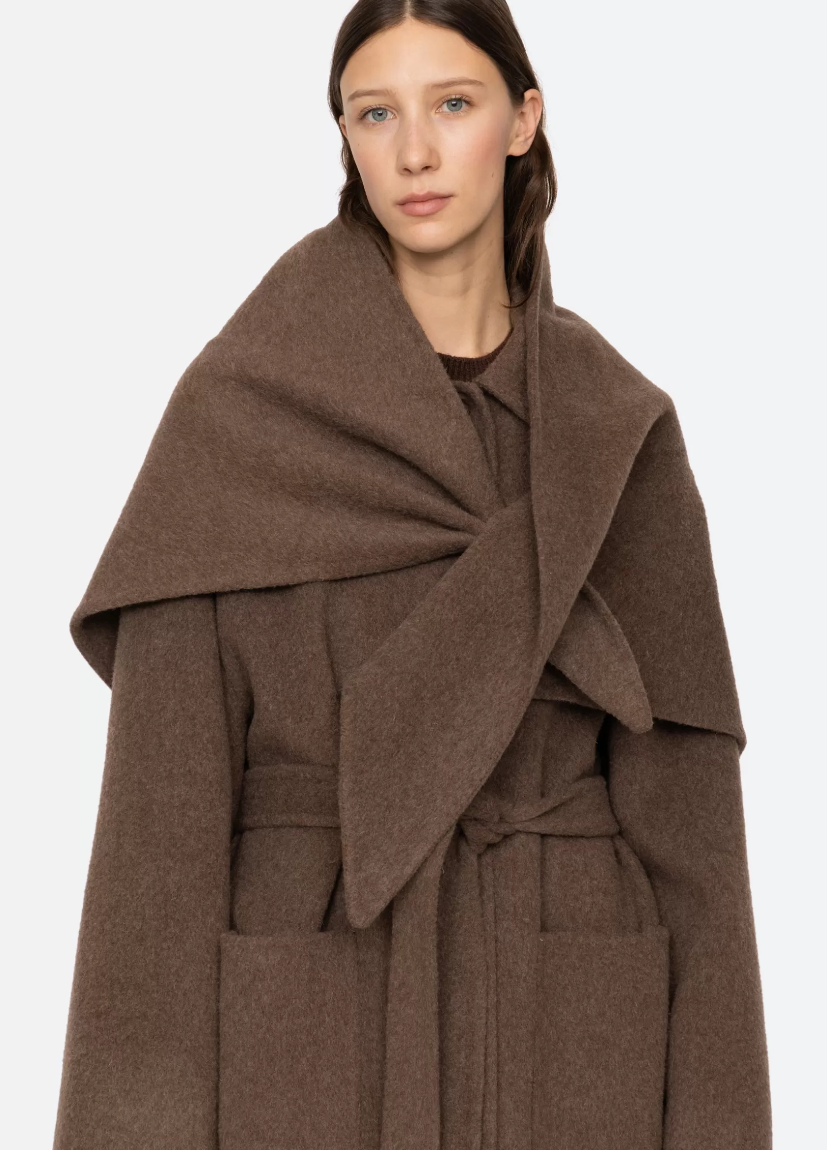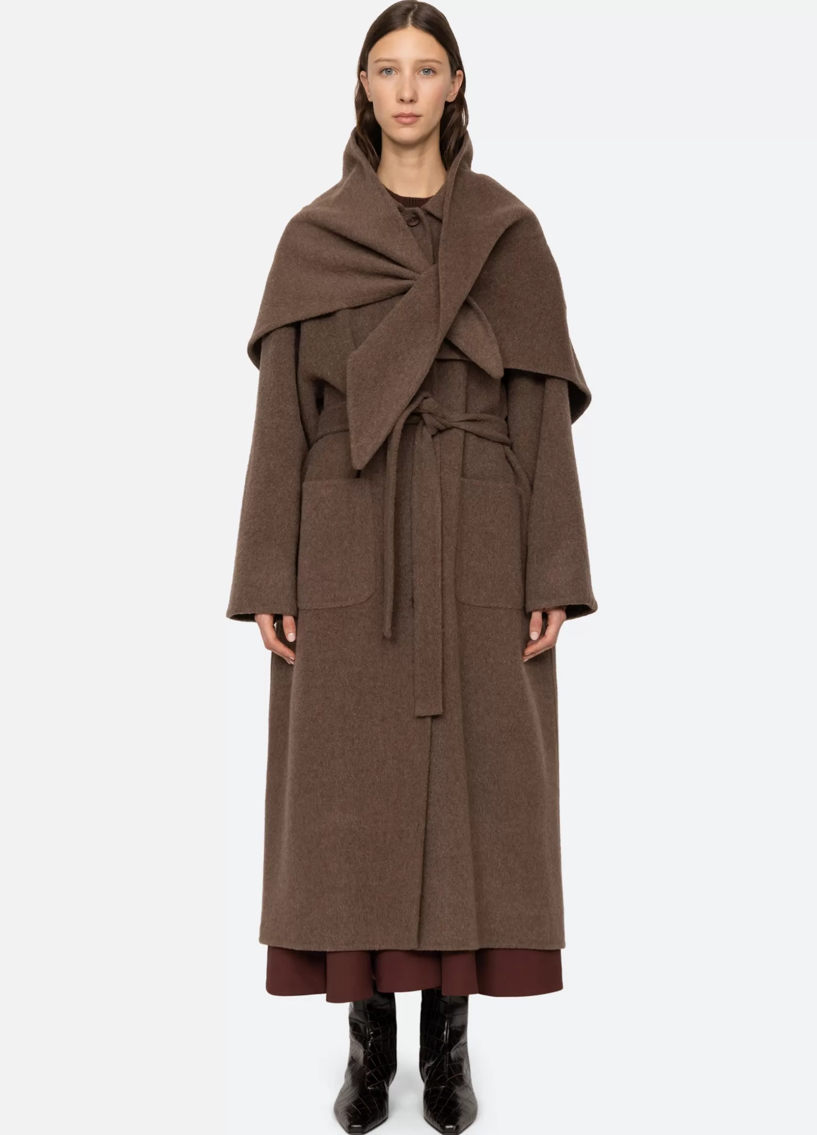 The Viv wool coat features an oversized detachable scarf and removable belt.