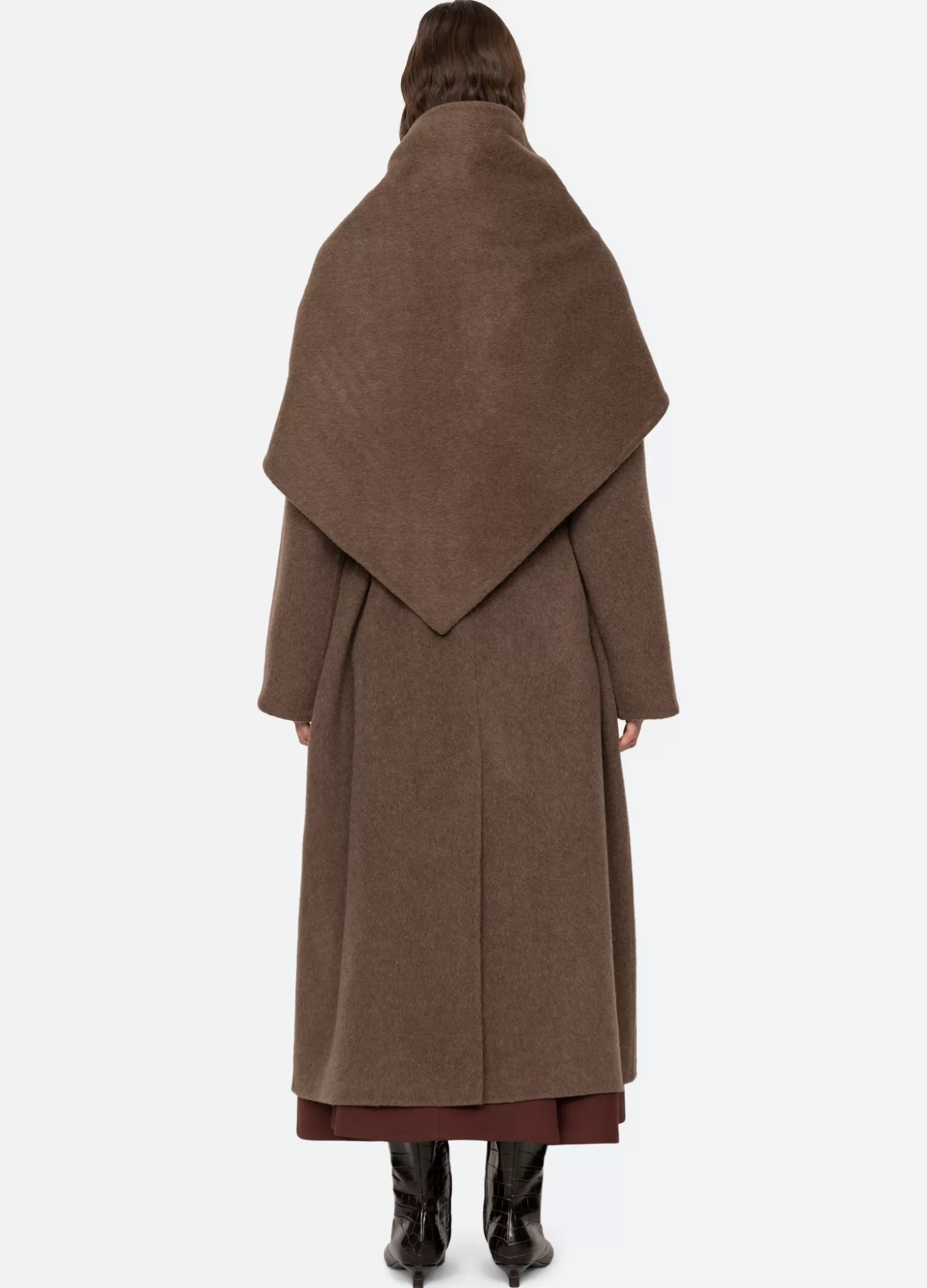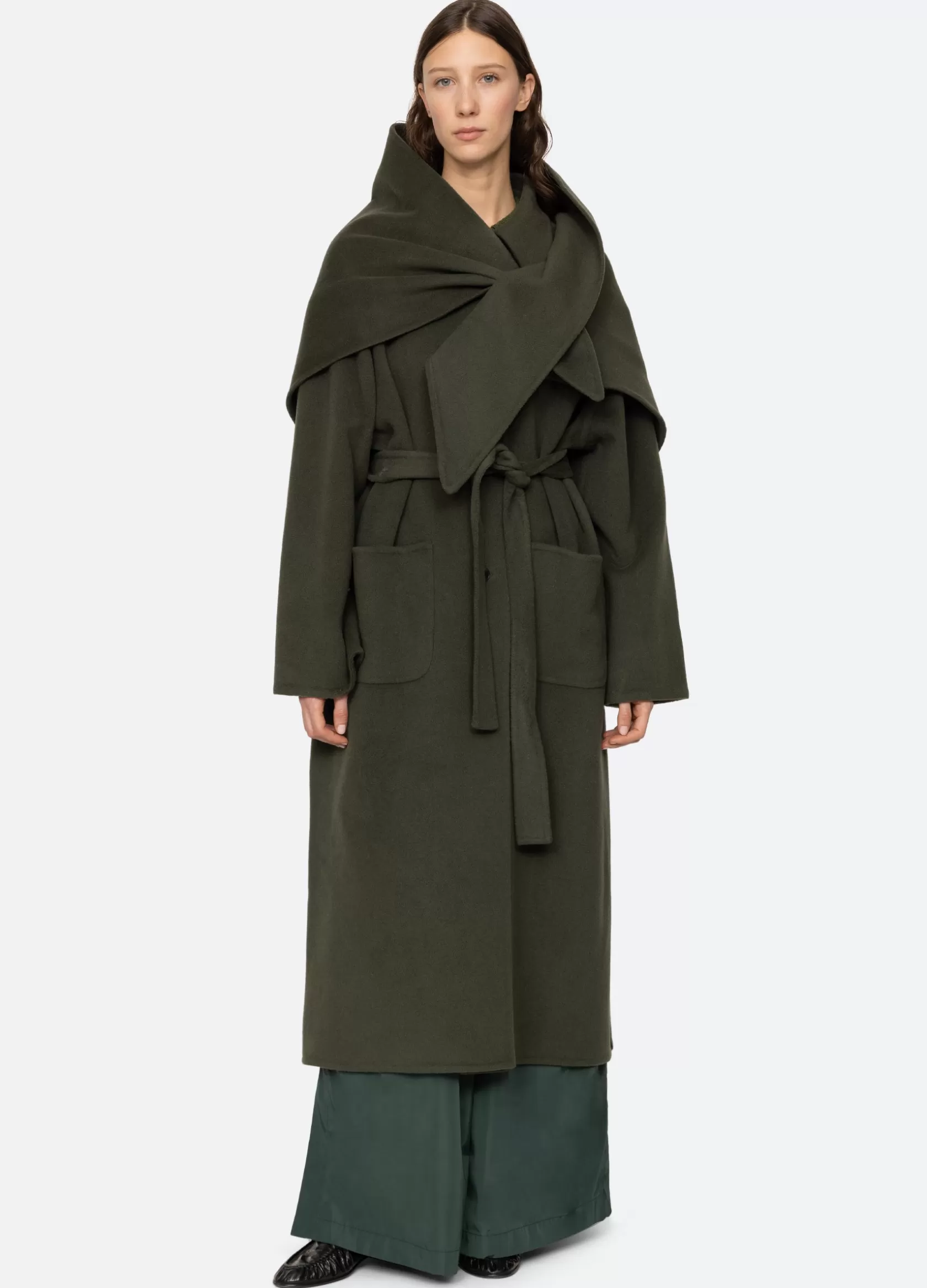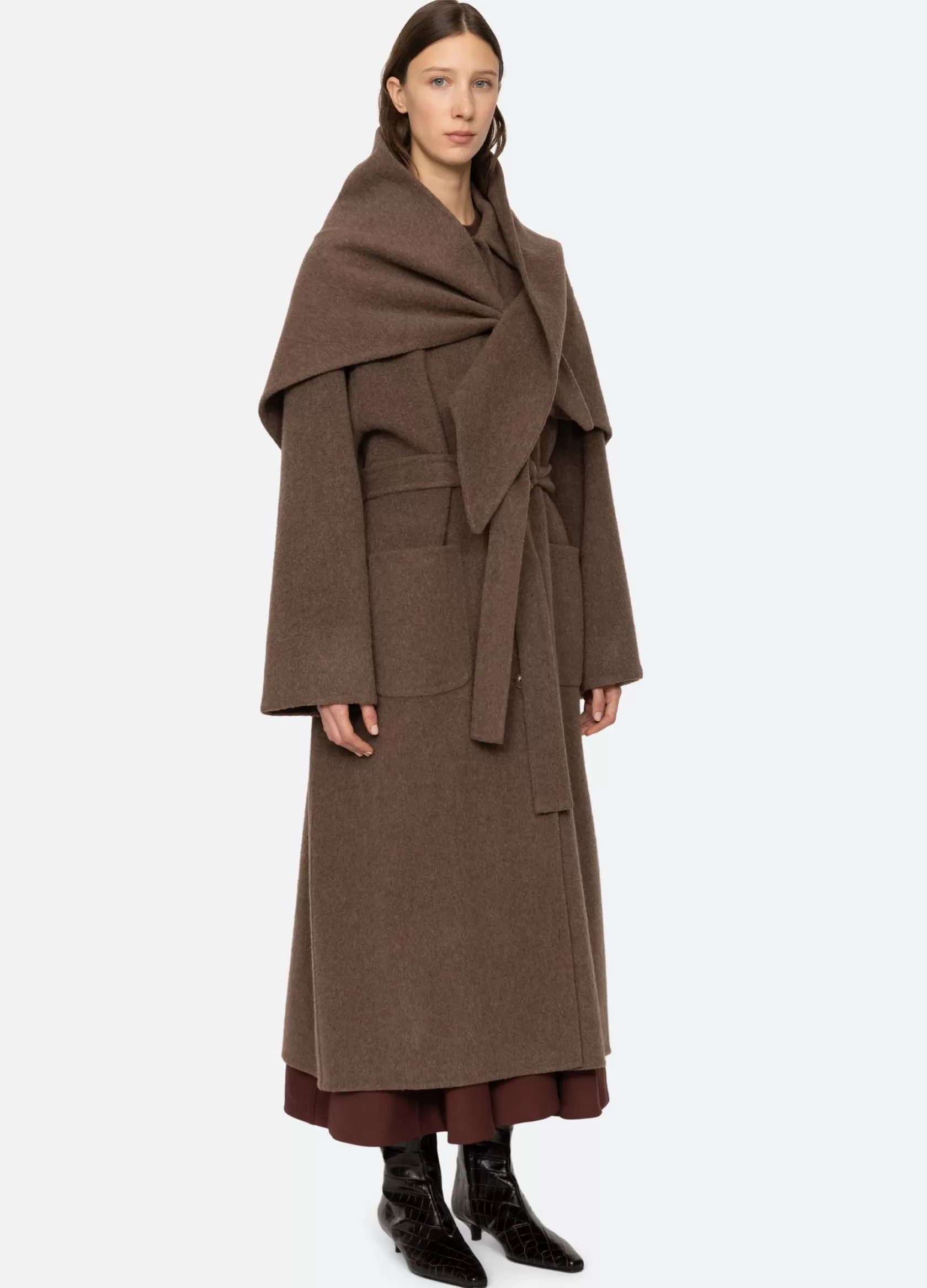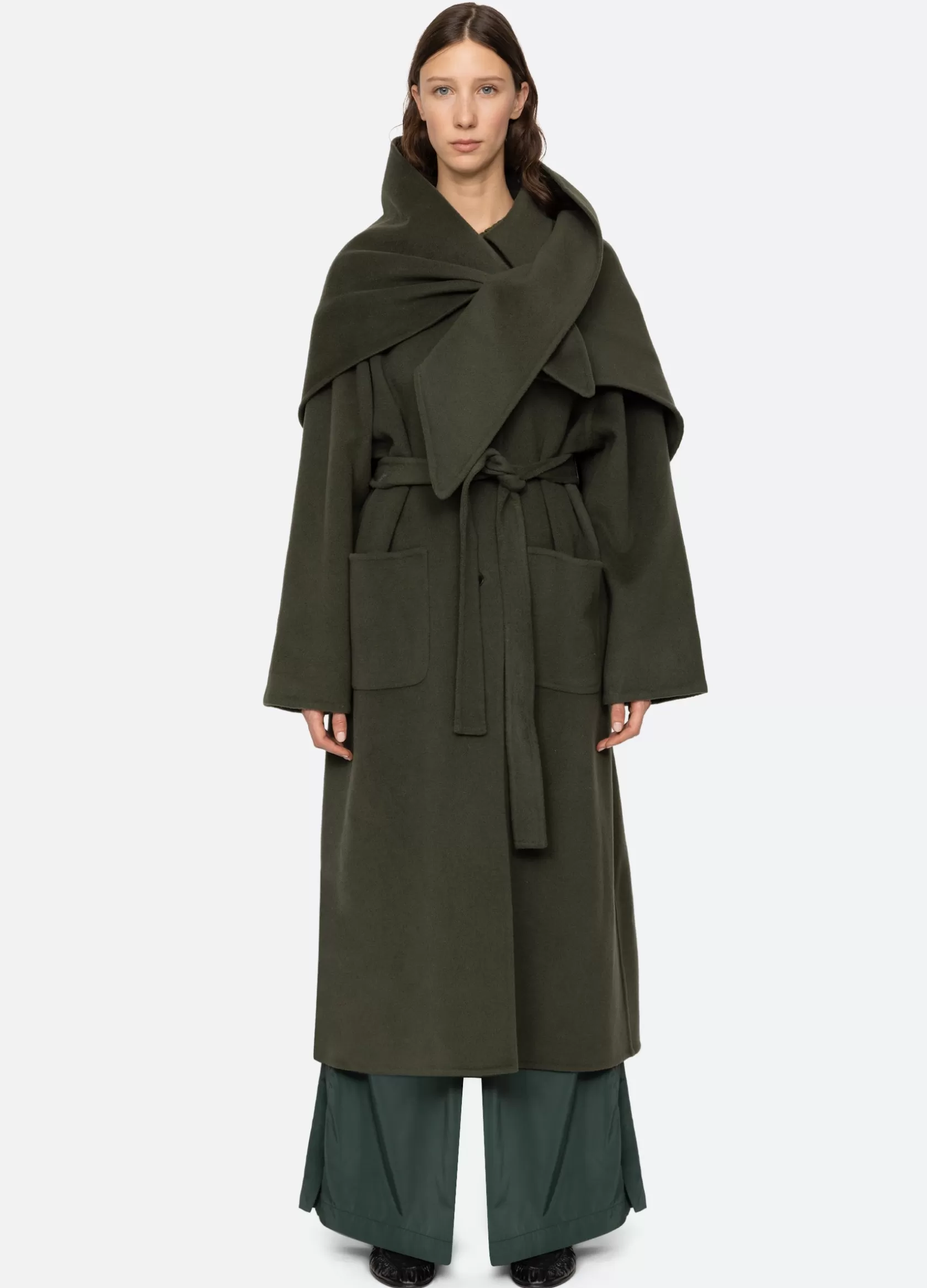 The Viv wool coat features an oversized detachable scarf and removable belt.
