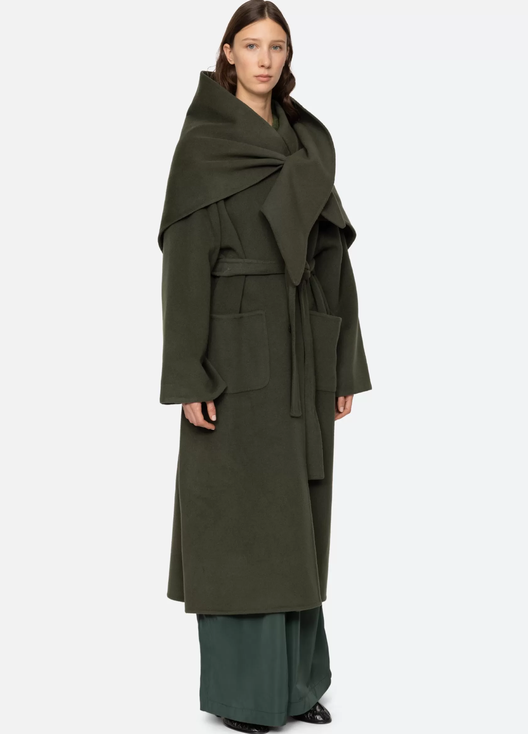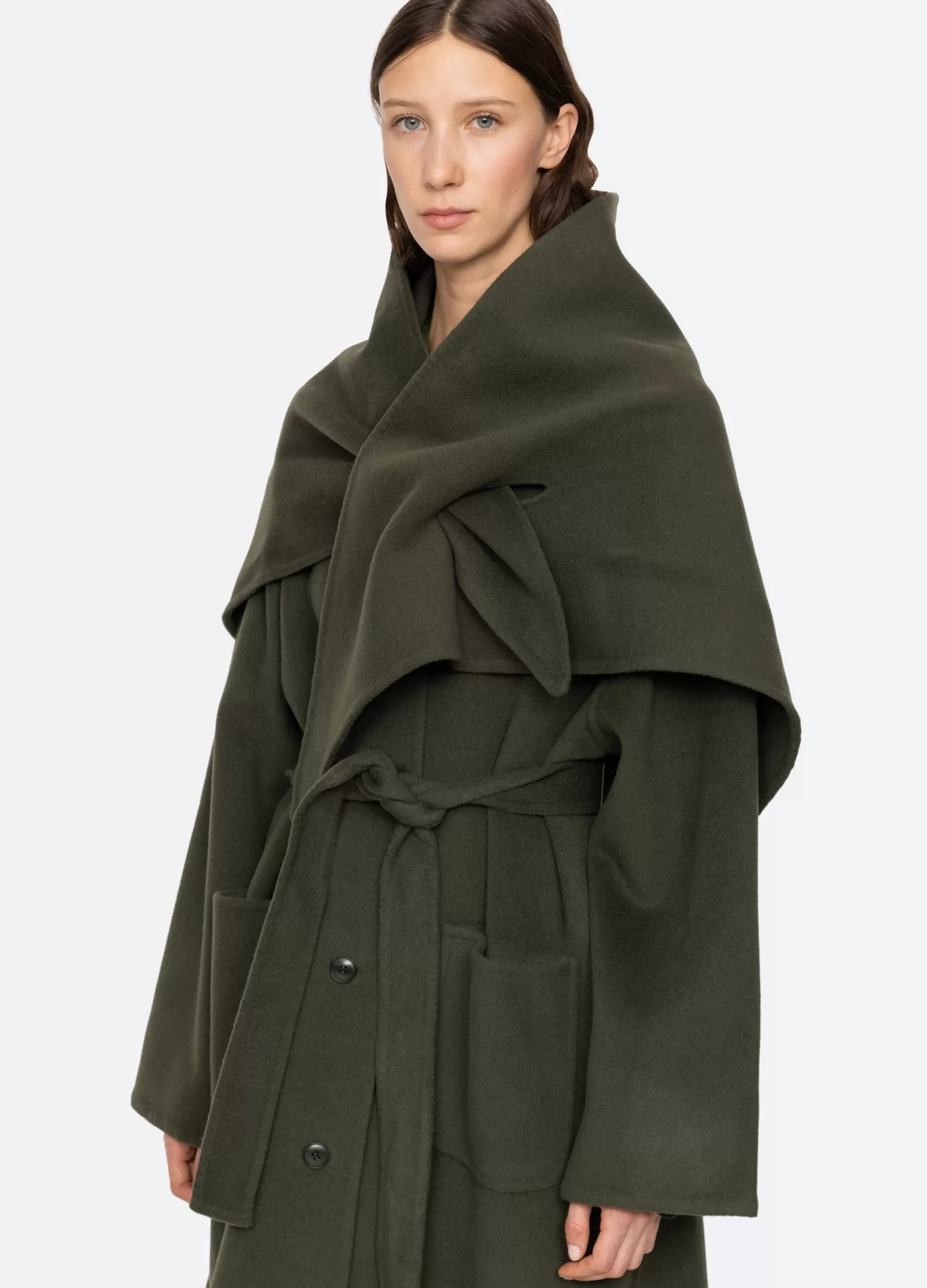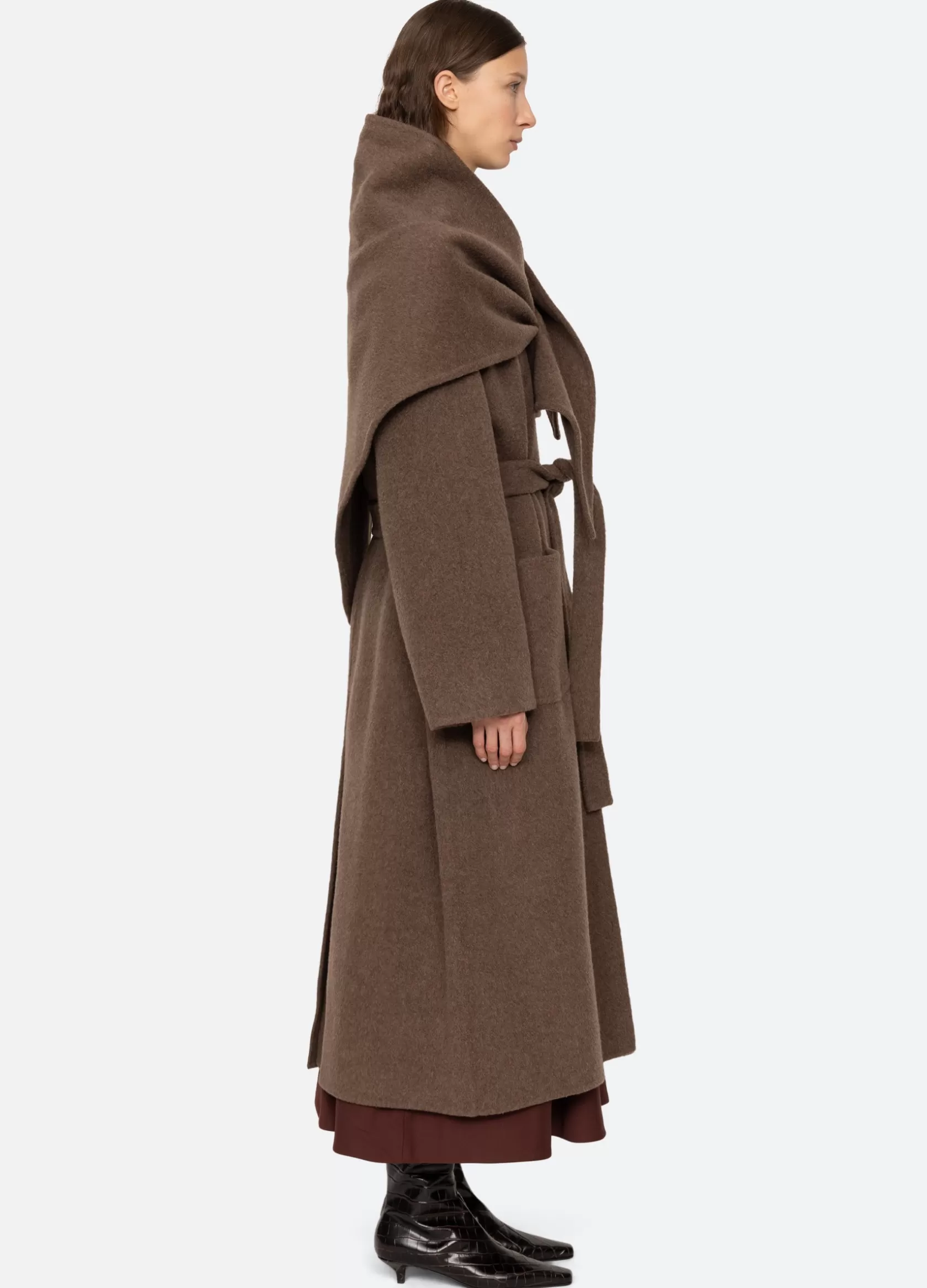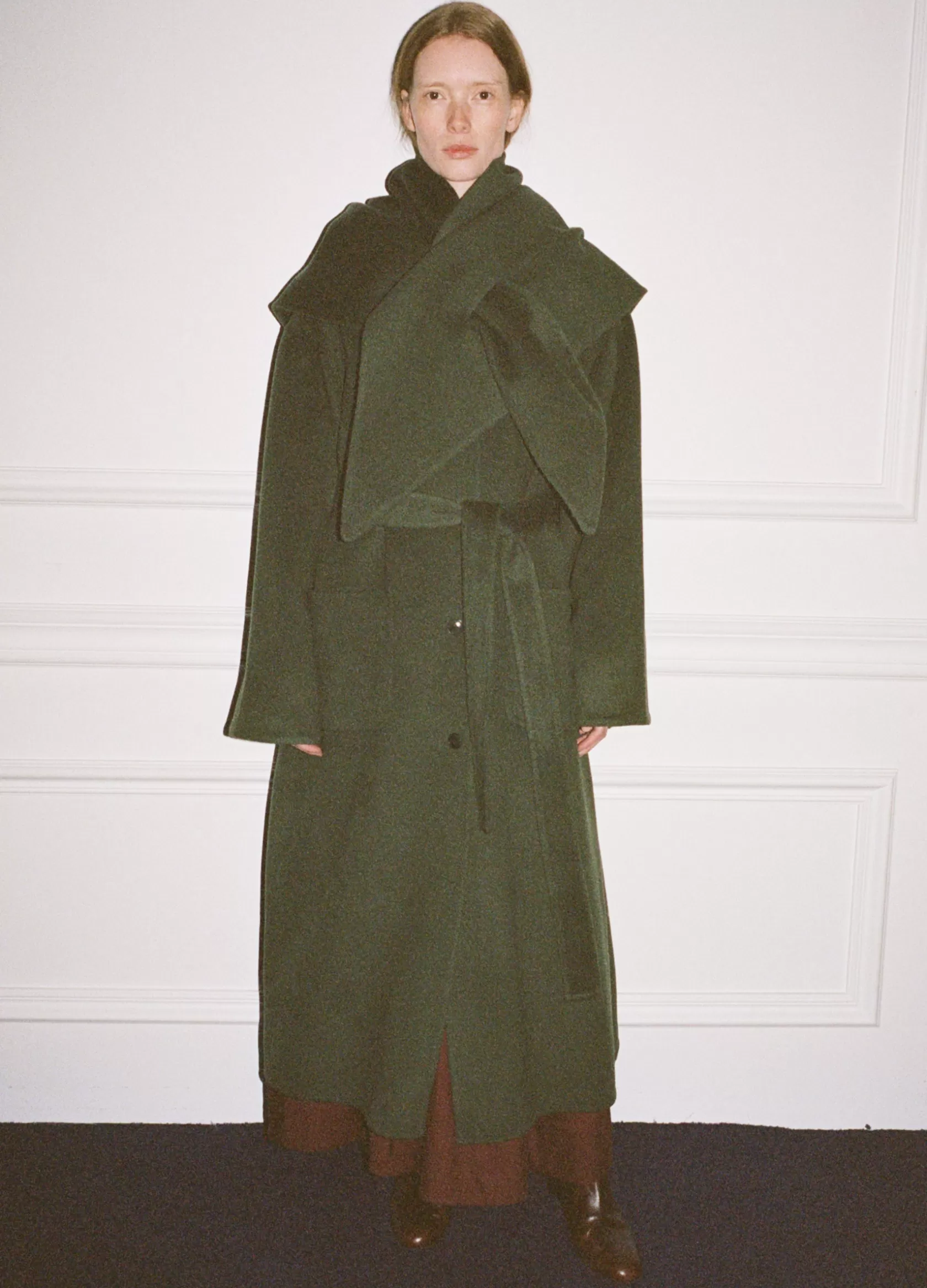 The Viv wool coat features an oversized detachable scarf and removable belt.