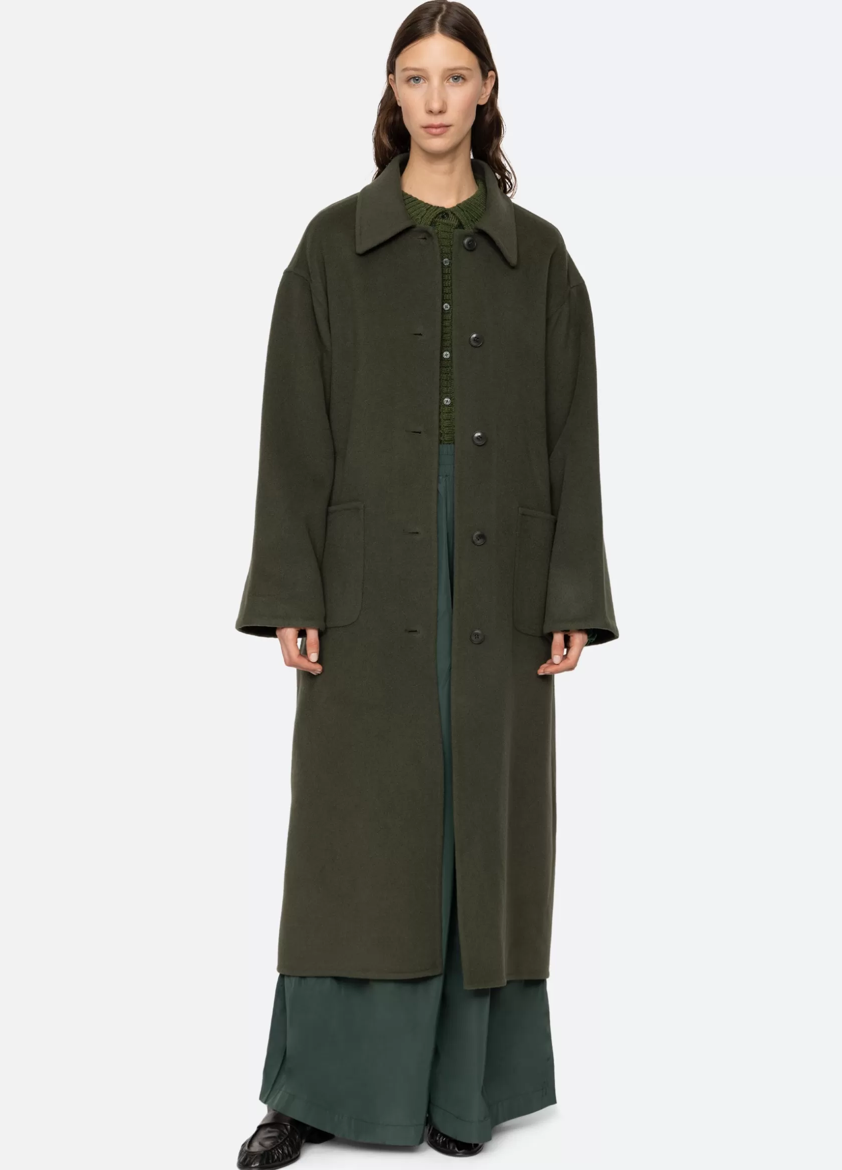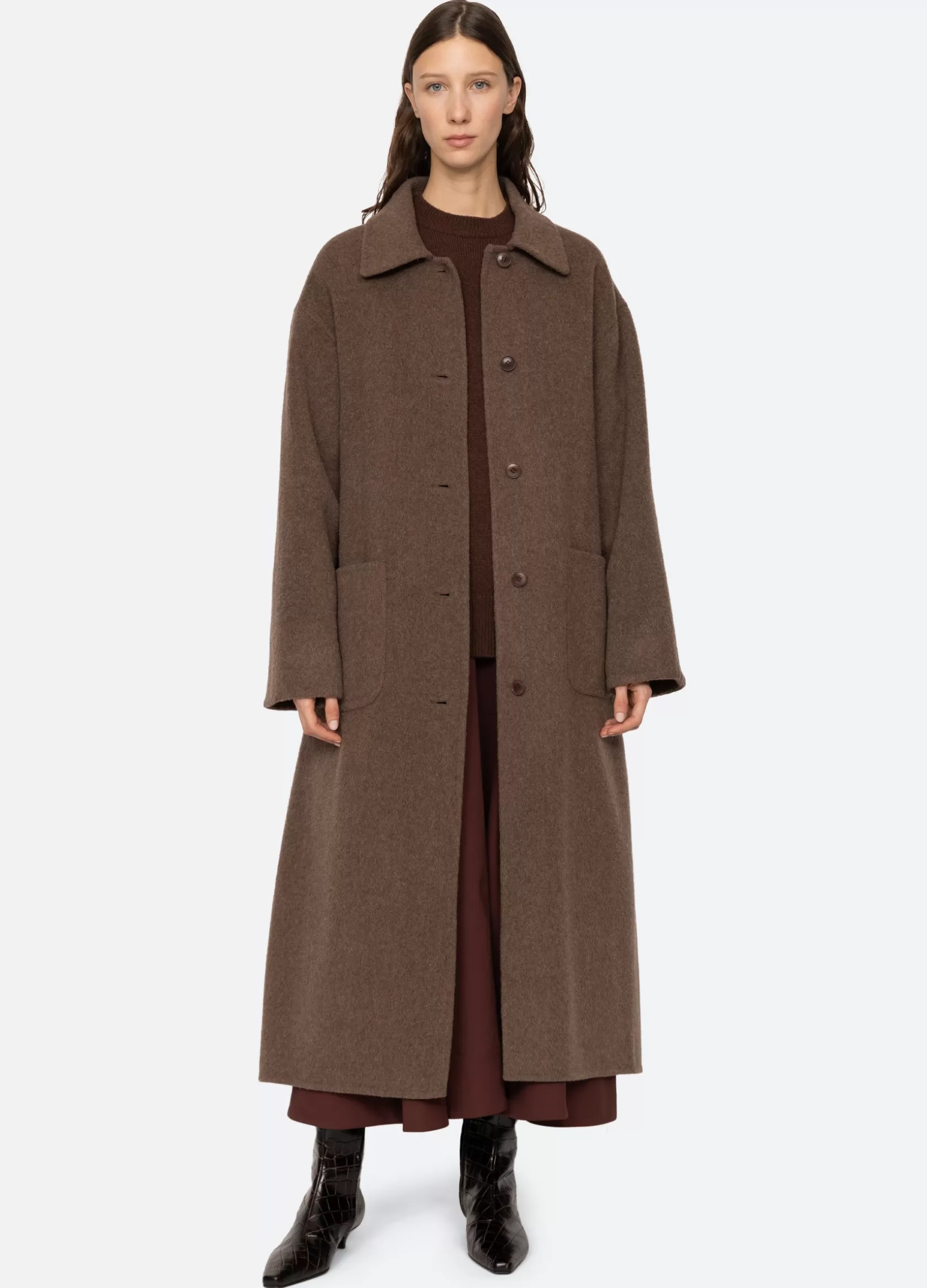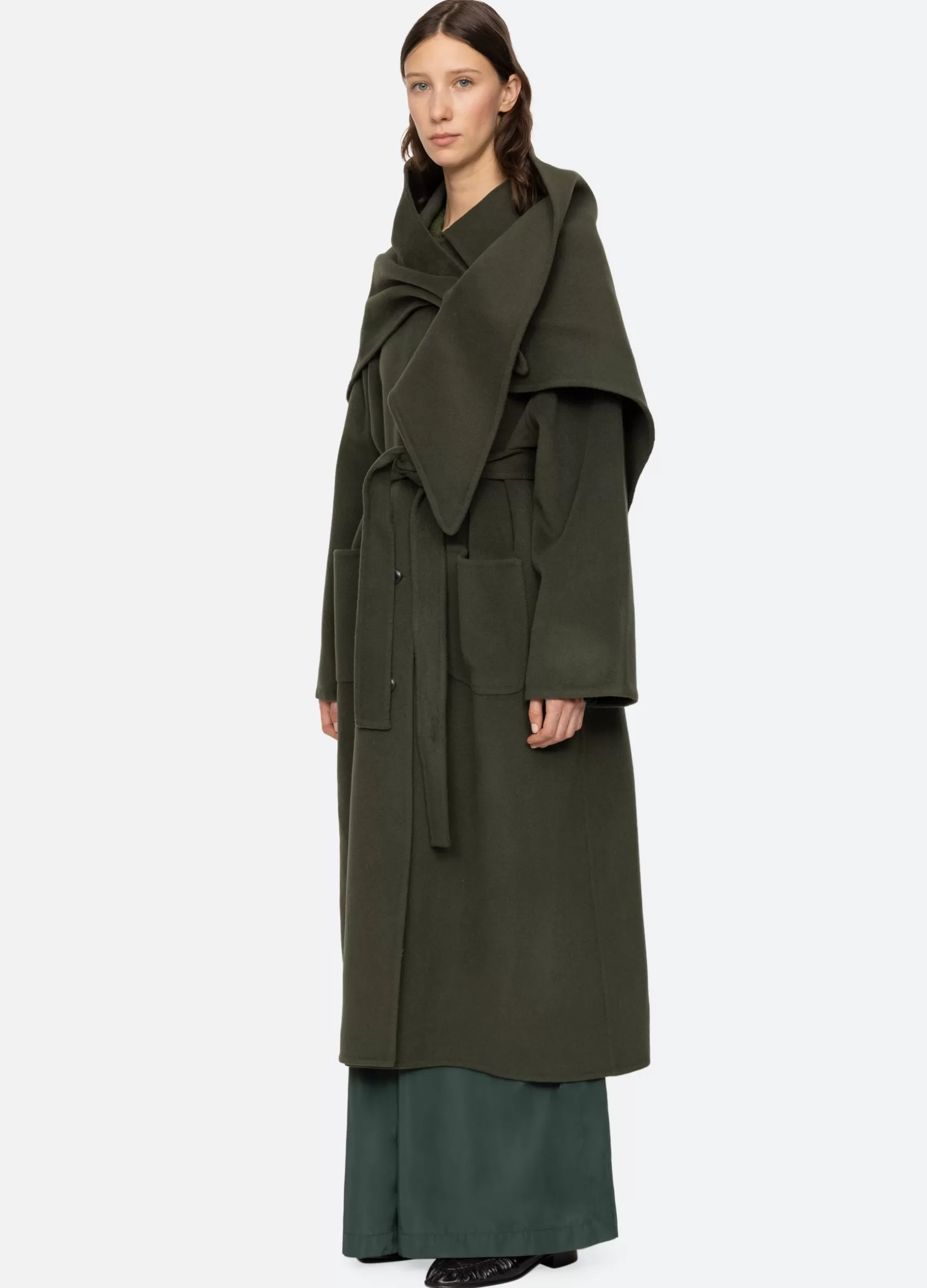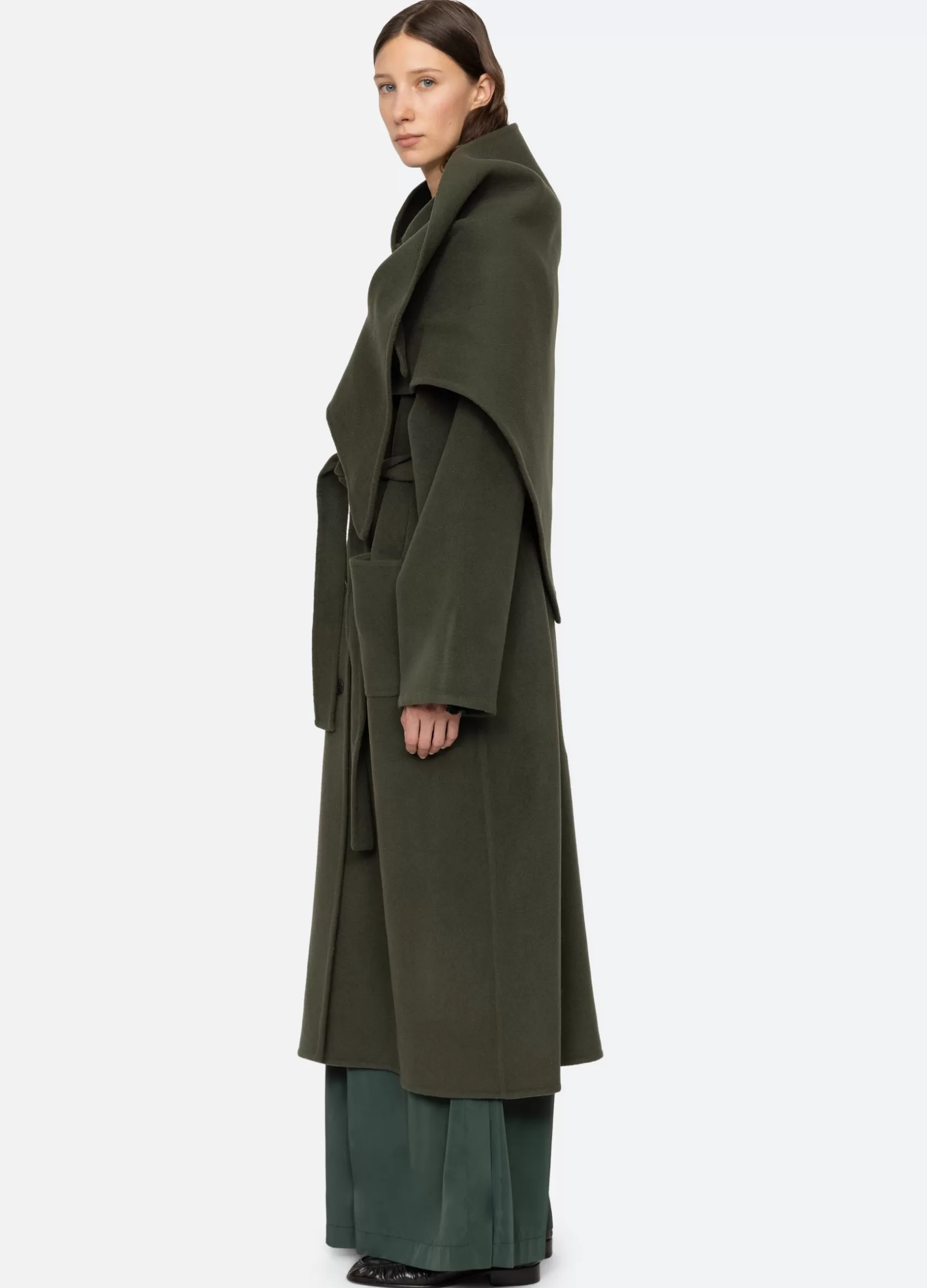 The Viv wool coat features an oversized detachable scarf and removable belt.