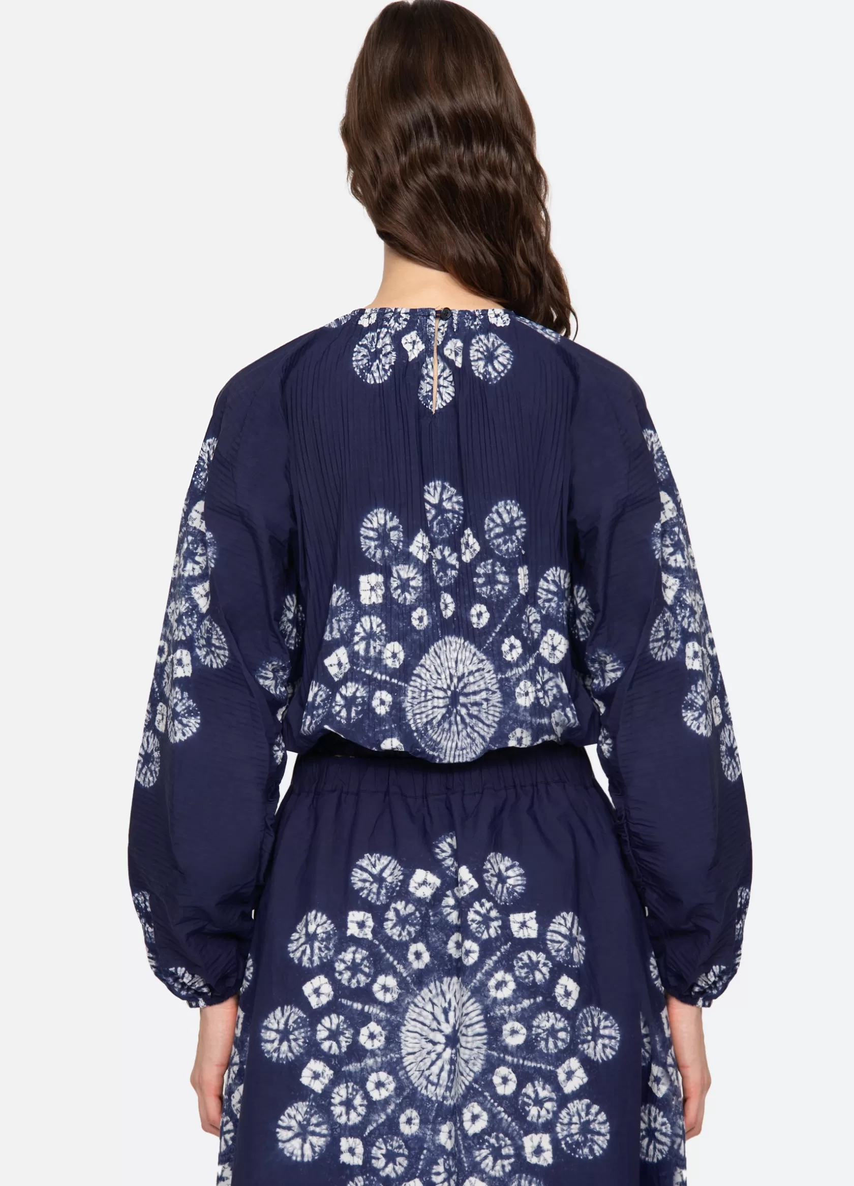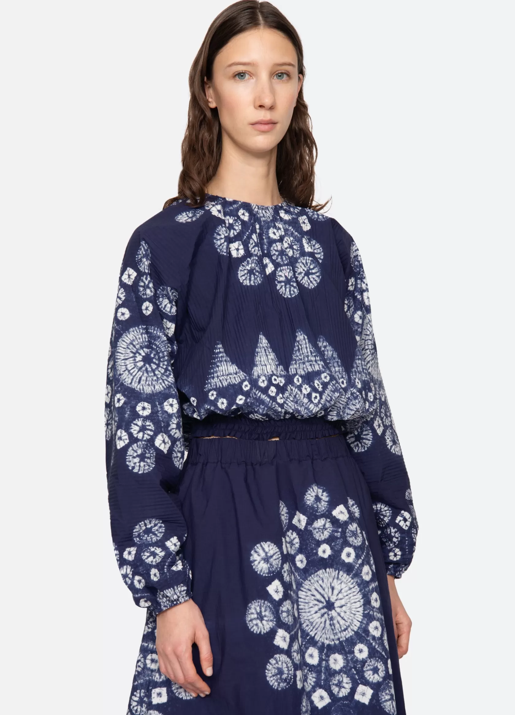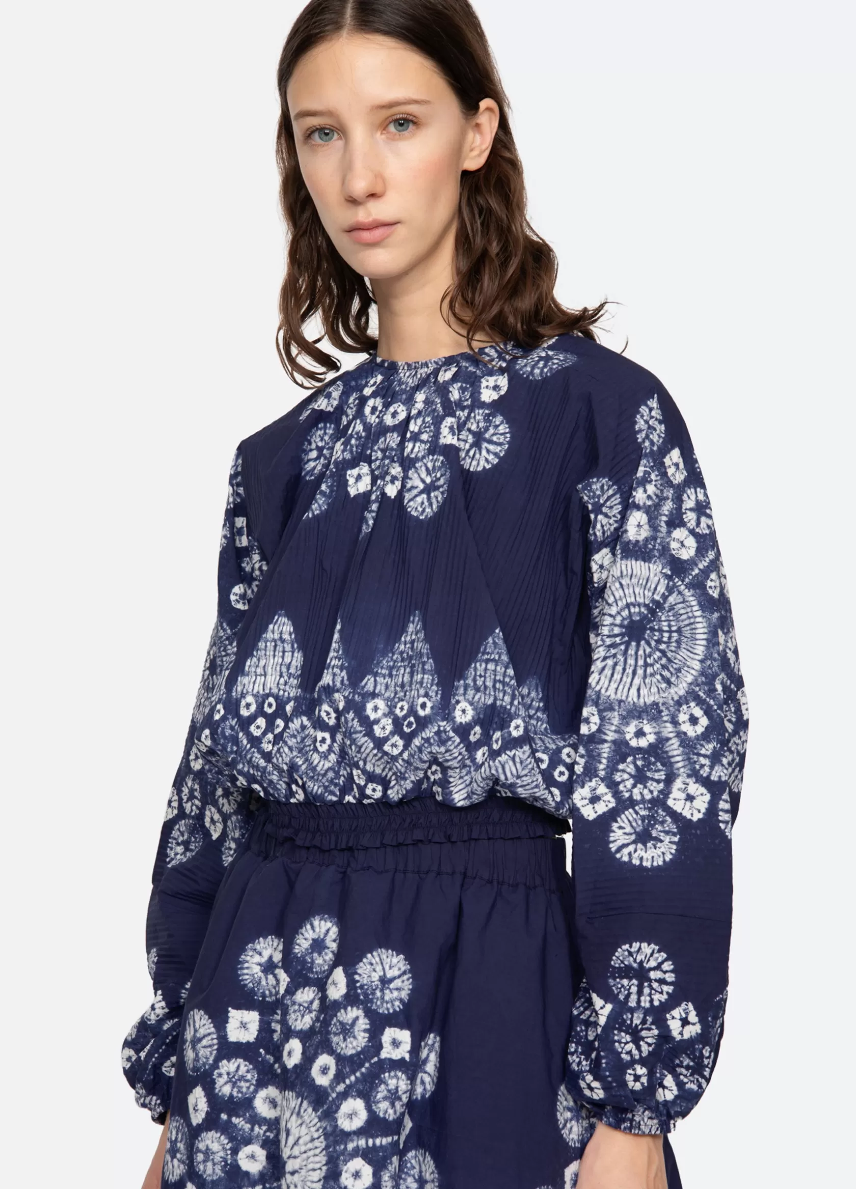 The Yana tie dye print long sleeve top features long puff sleeves, cropped silhouette, elasticized waistband and pleated detailing throughout.