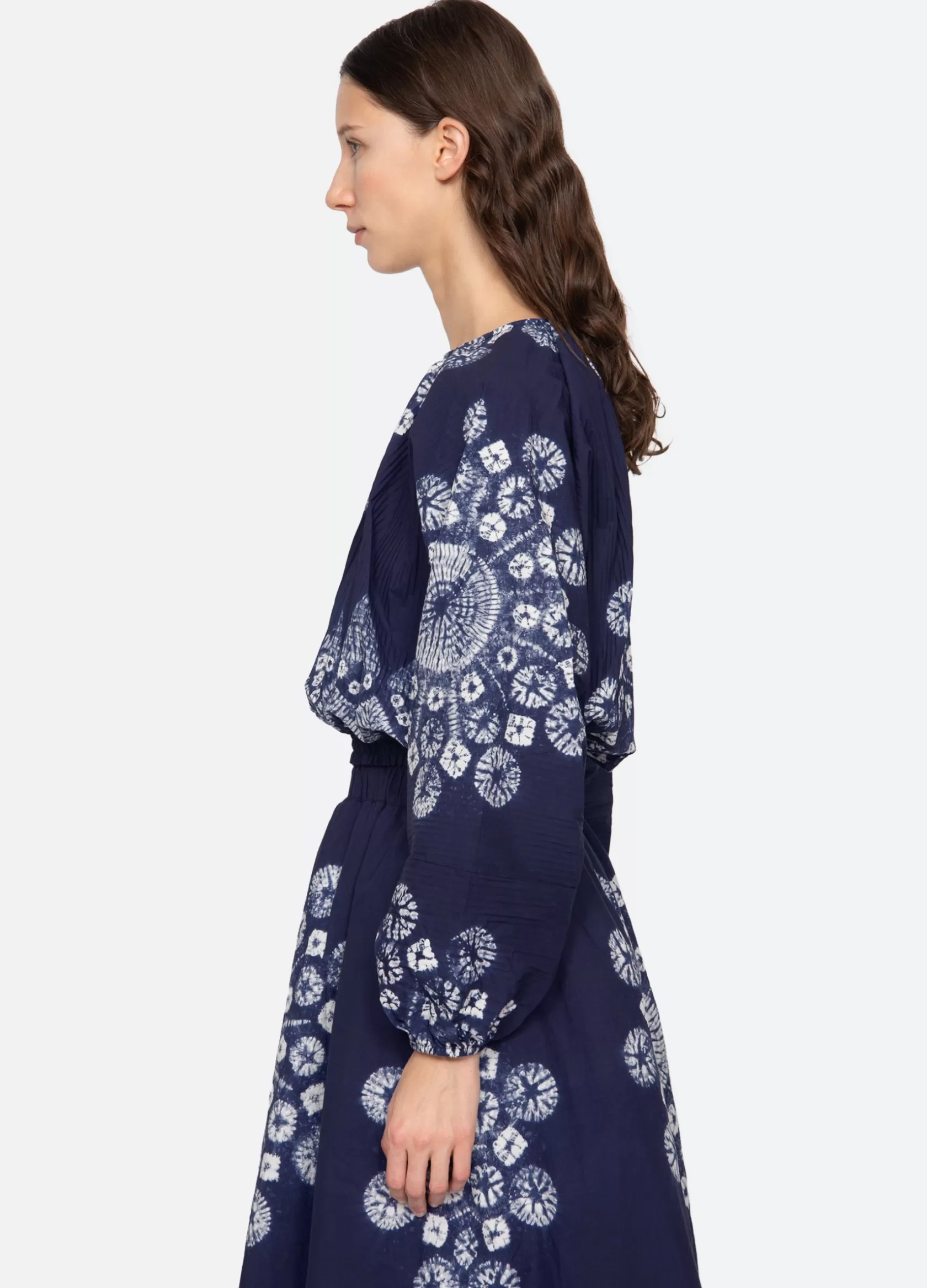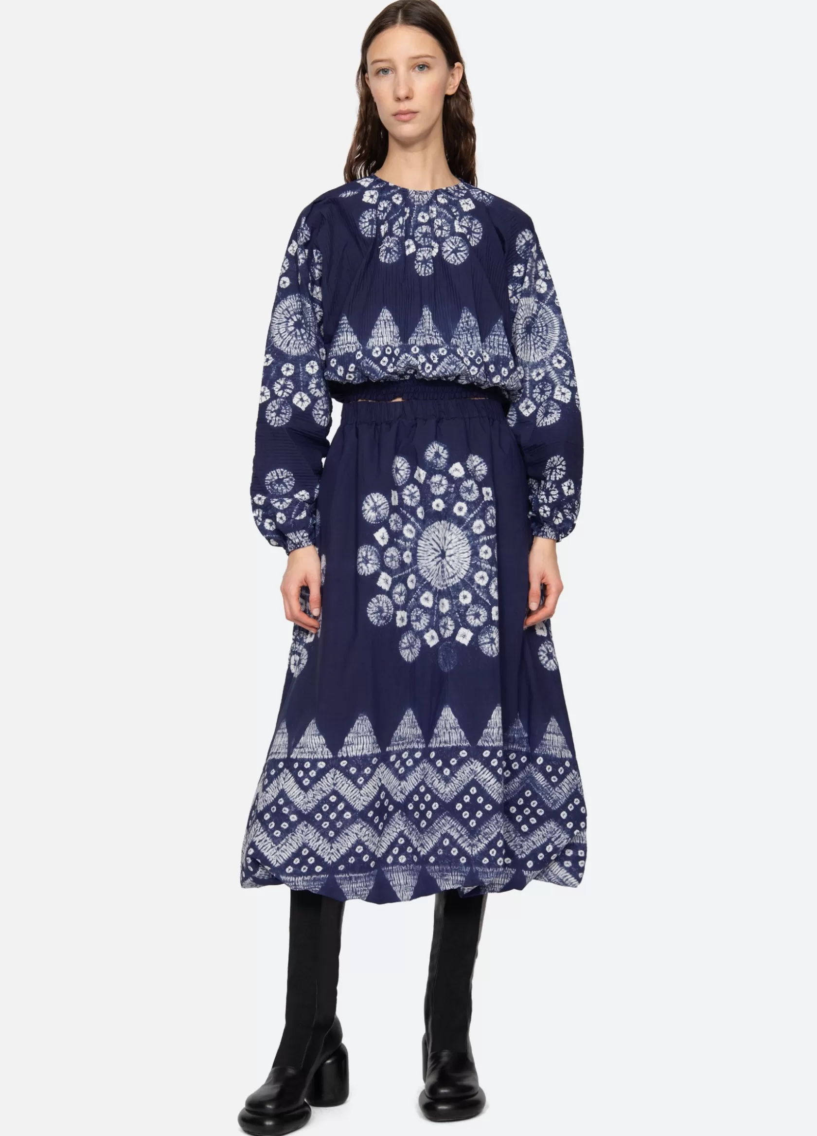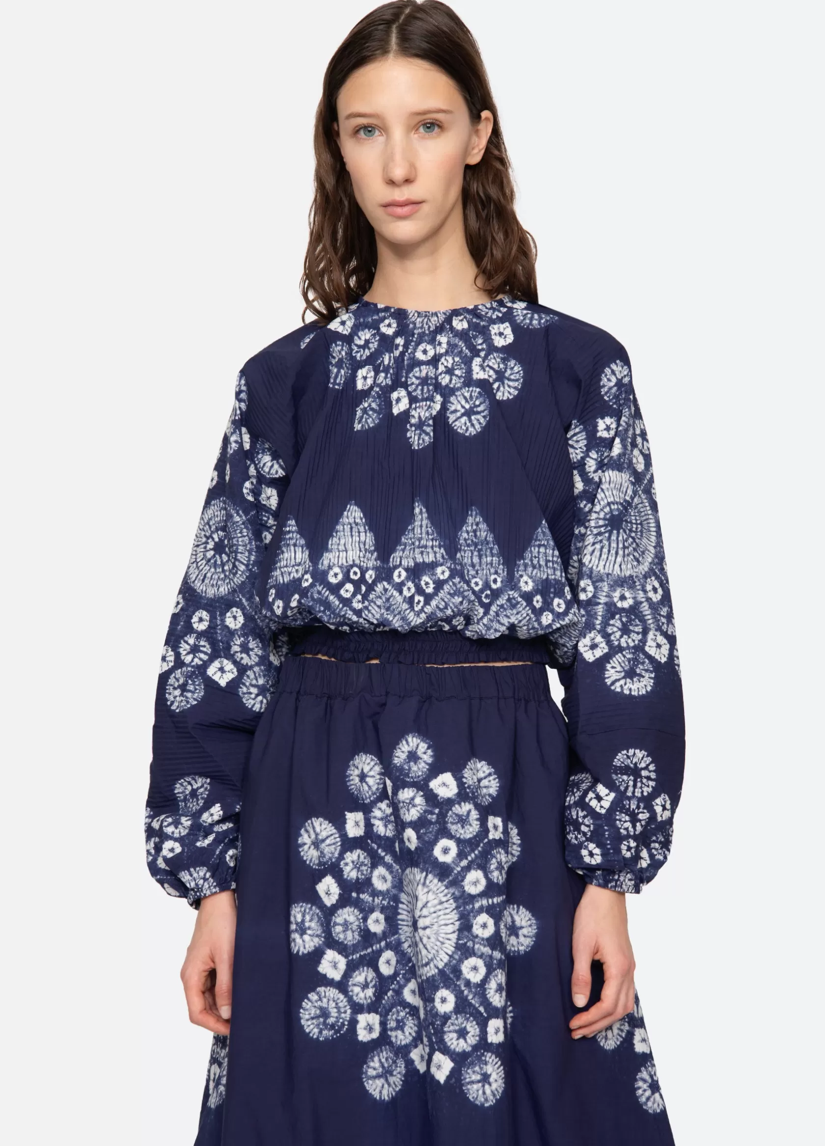 The Yana tie dye print long sleeve top features long puff sleeves, cropped silhouette, elasticized waistband and pleated detailing throughout.