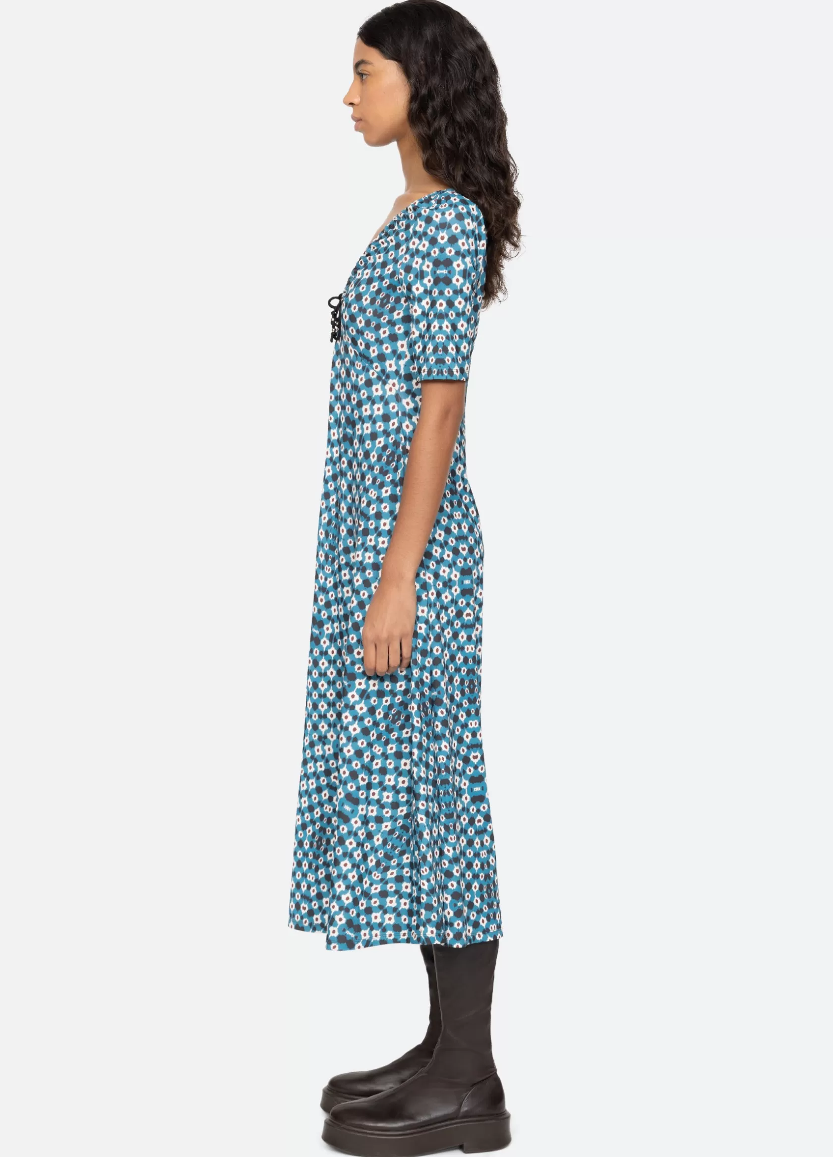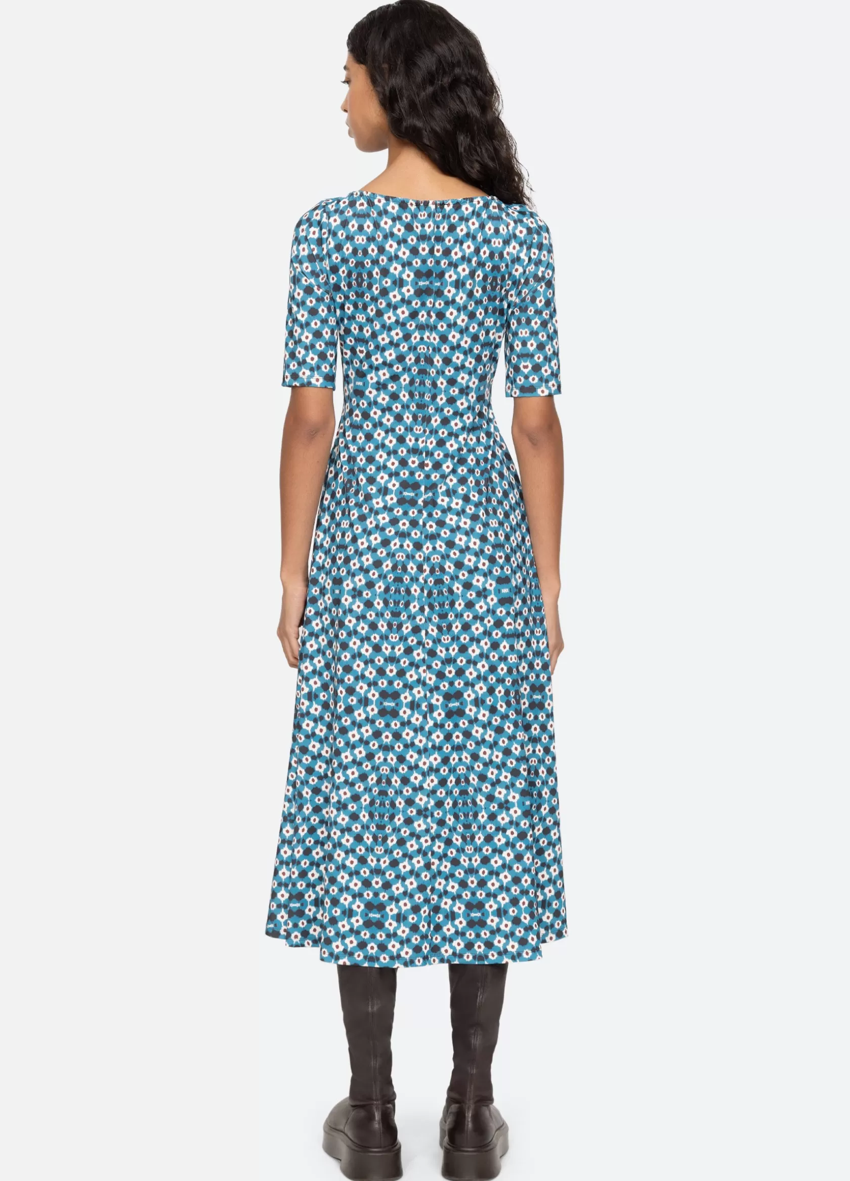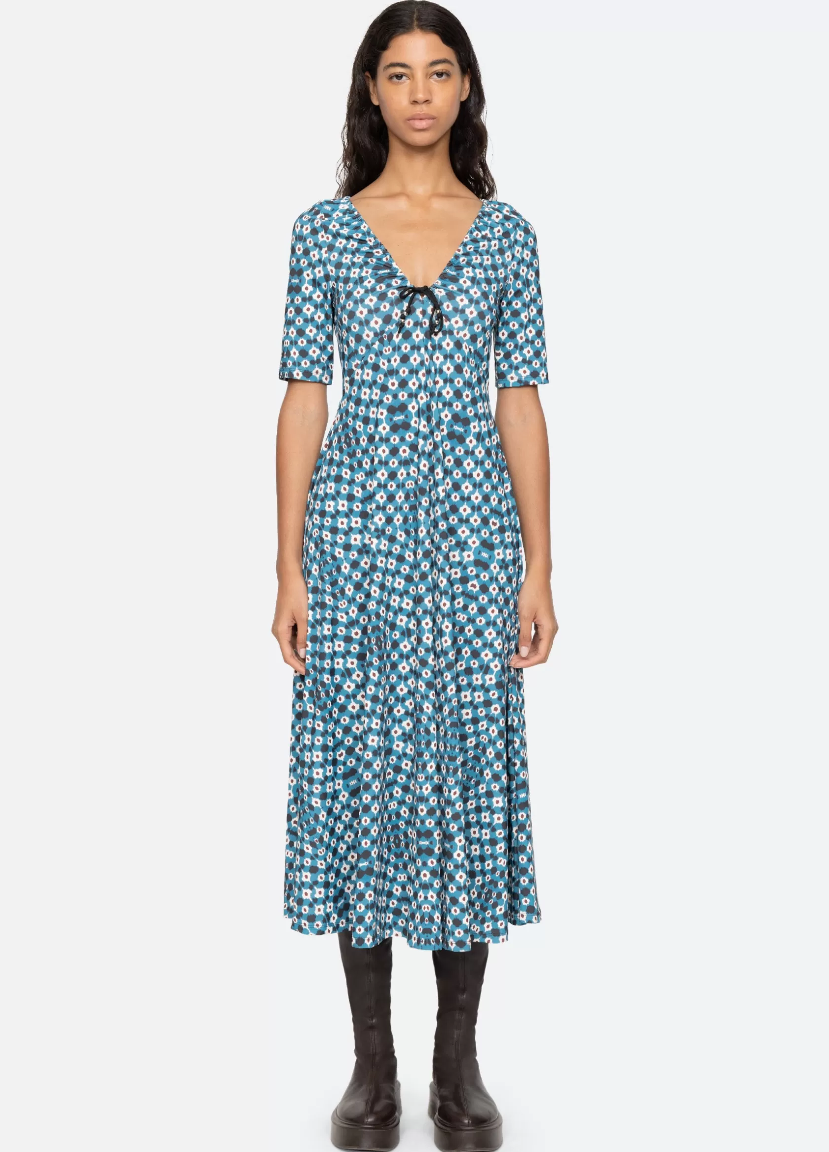 An online and in store exclusive. The Zina graphic print short sleeve dress features a midi silhouette, v-neckline and r…