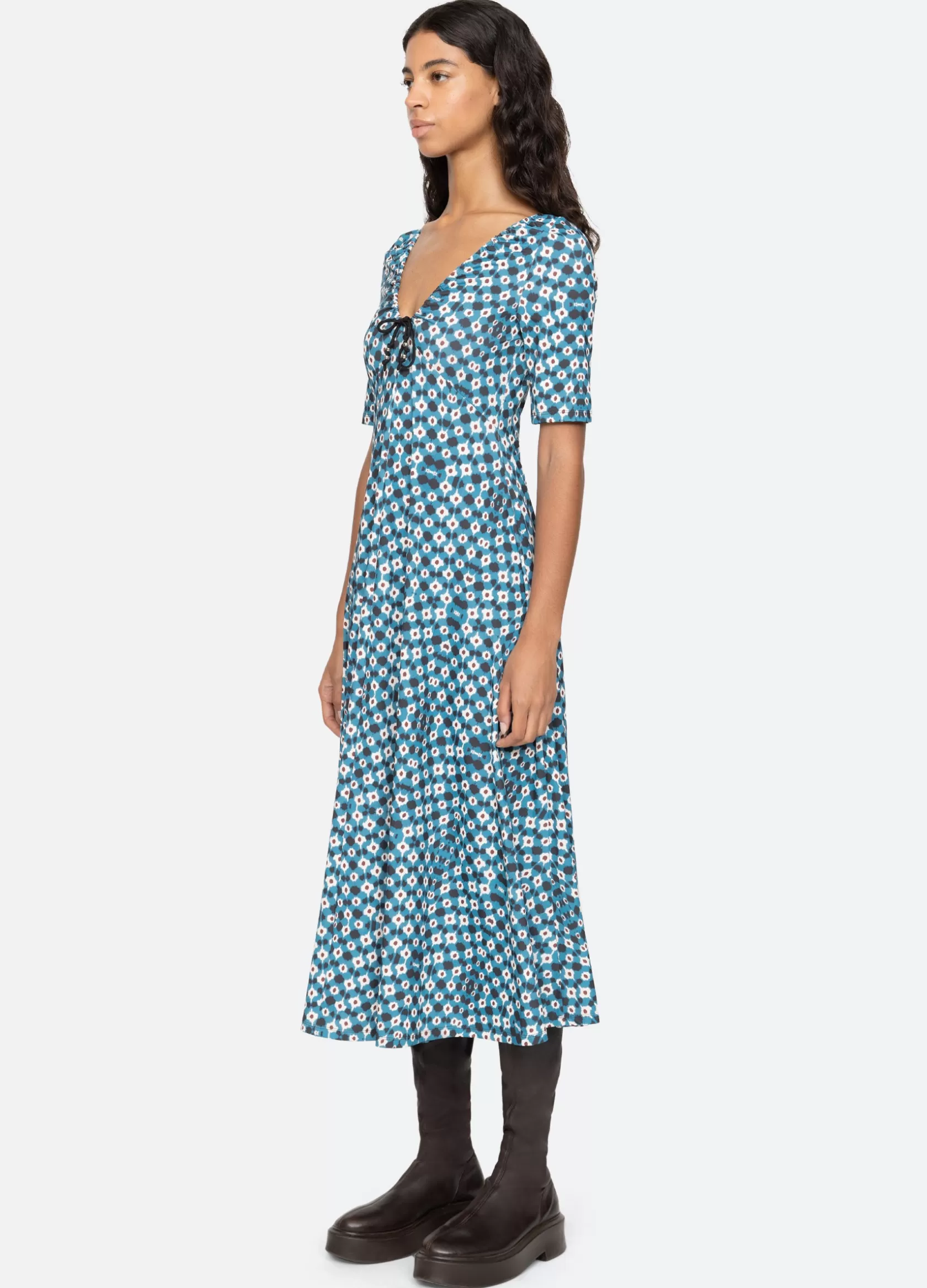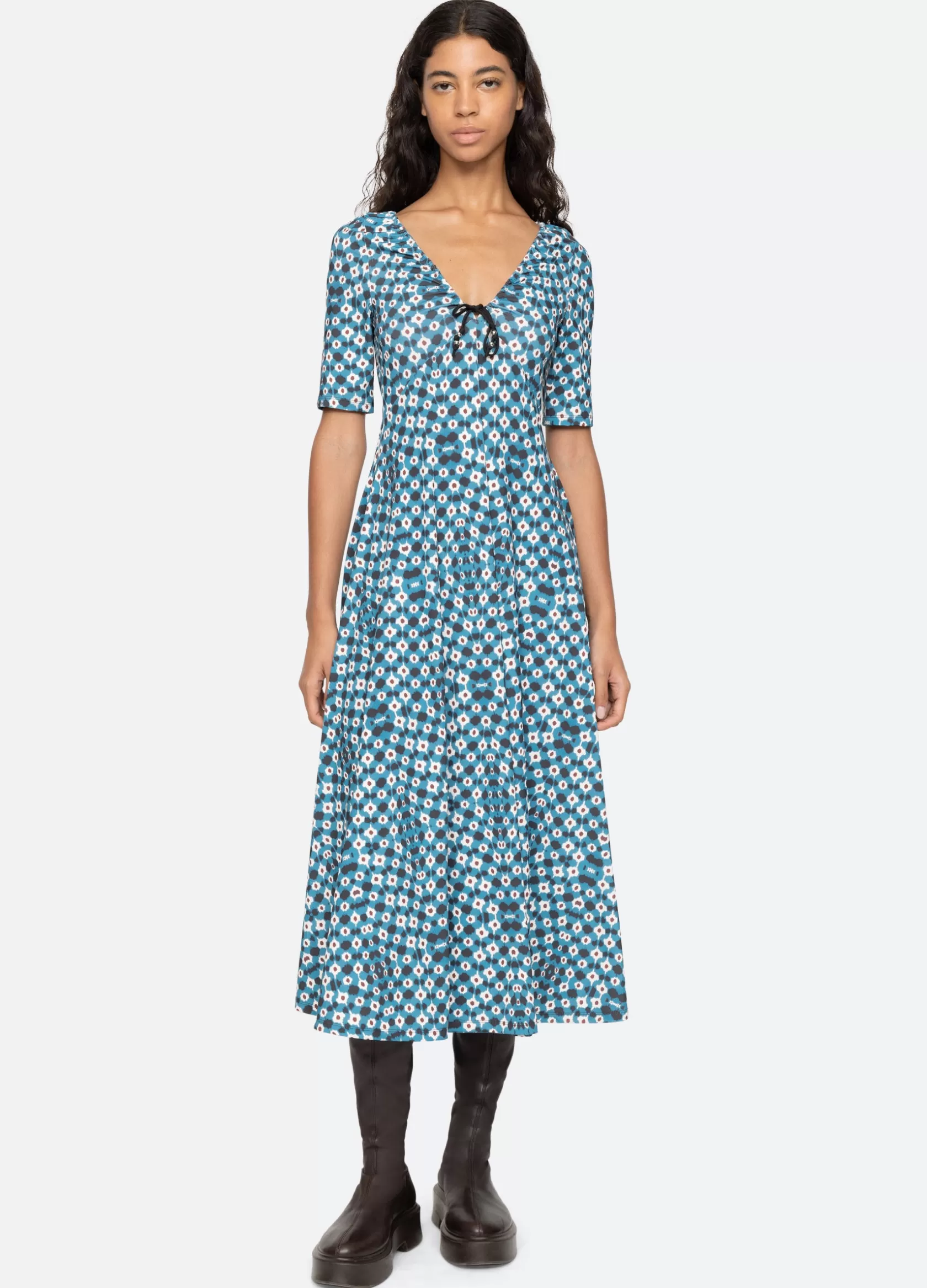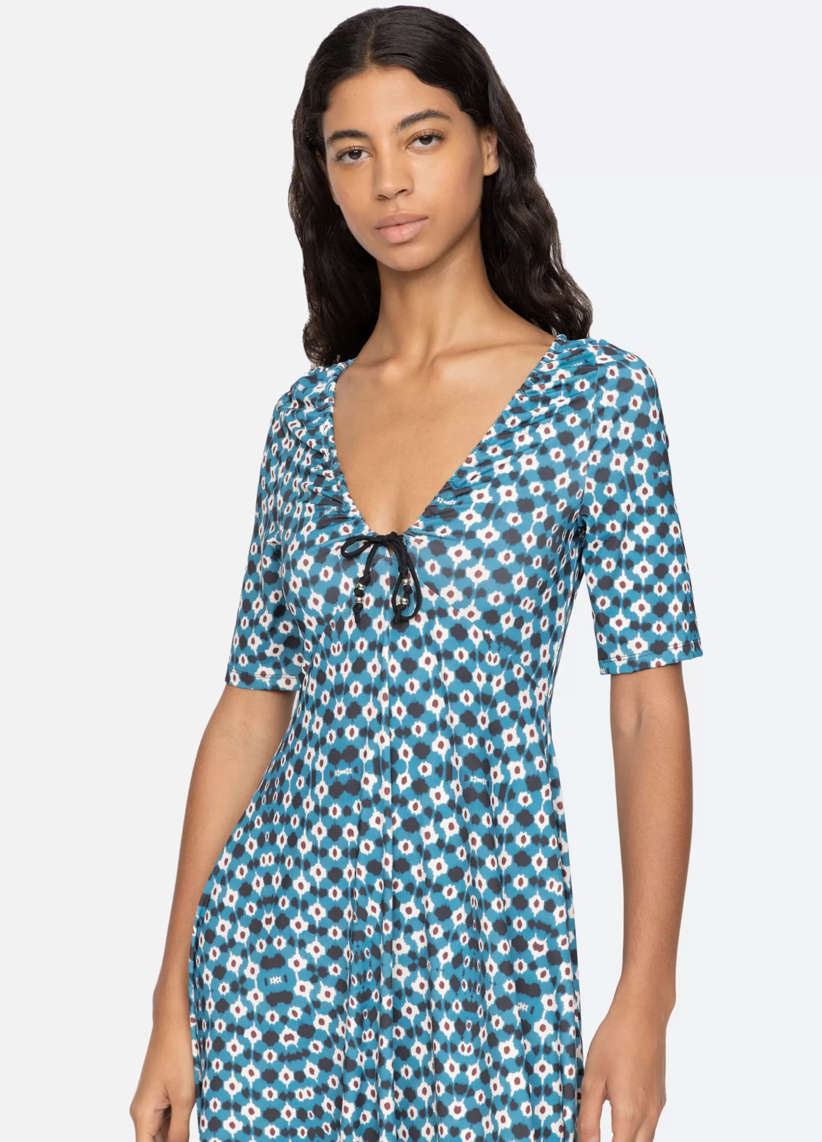 An online and in store exclusive. The Zina graphic print short sleeve dress features a midi silhouette, v-neckline and ruched detailing.